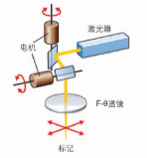 激光打标是利用从激光器中输出的聚焦光束与被标记的目标物体相互作用,从而在目标物体上形成高品质的永久性标记。图1给出了典型的激光打标机的原理示意图。从激光器中输出的光束,由安装在高速精密电机上的两个反射镜控制,以实现光束的运动打标。每个反射镜都沿着单一的轴线运动。电机的运动速度非常快,并且惯性非常小,从而能够实现对目标物体的快速打标。经过反射镜引导的光束利用F-θ透镜聚焦,焦点位于被标记的平面上。当该聚焦光束与被标记物体相互作用时,物体就被“打上标记”了。除了被打标的位置,物体的其他表面仍然保持不变。